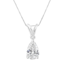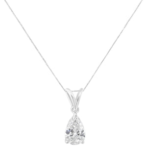 This timeless design features a pear cut diamond hanging from a delicate chain. A classic design to last a lifetime. It is crafted in 10 karat white gold and has a total diamond weight of 1/2 carats.