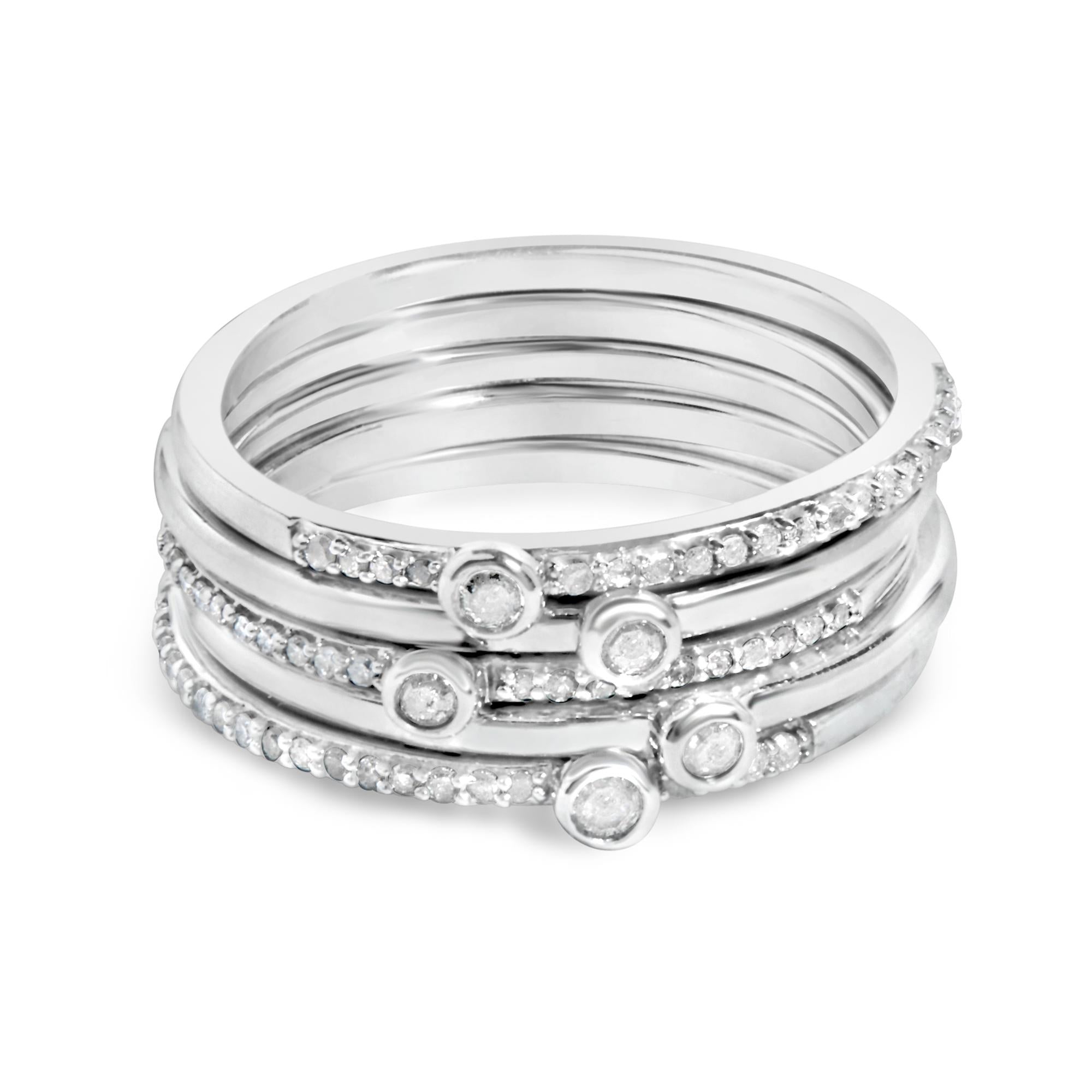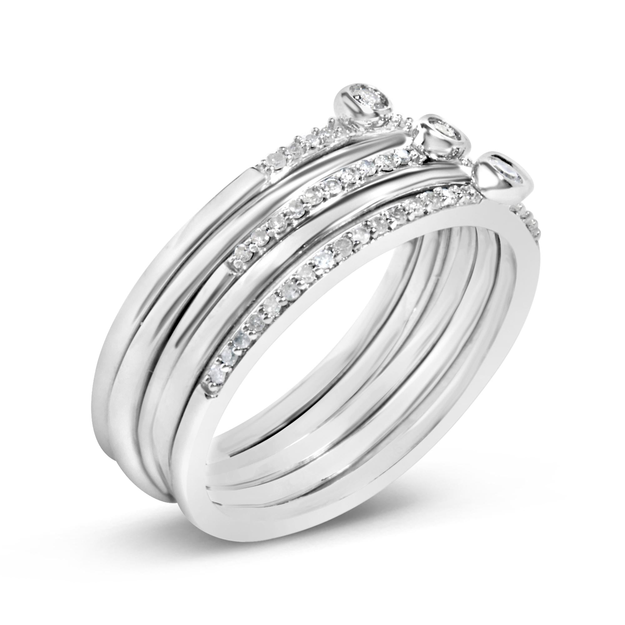 Embrace the subtle elegance of this .925 sterling silver stackable ring set, designed to shimmer with every flicker of light. Elegantly crafted with natural round-cut diamonds boasting an I-J color and I3 clarity, this set is a testament to refined taste and sophistication. The combination of bezel and pavé settings on each band interplays beautifully, capturing the essence of modern luxury while ensuring versatility and style. Perfect for those who appreciate the classic finish and durability of sterling silver, this fashion-forward ring set promises to enhance your everyday ensemble or add a glittering touch to special occasions. With each piece designed for harmonious stacking or standalone grace, this is an essential addition to any jewelry collection, promising to connect with your sense of style and personal expression effortlessly.