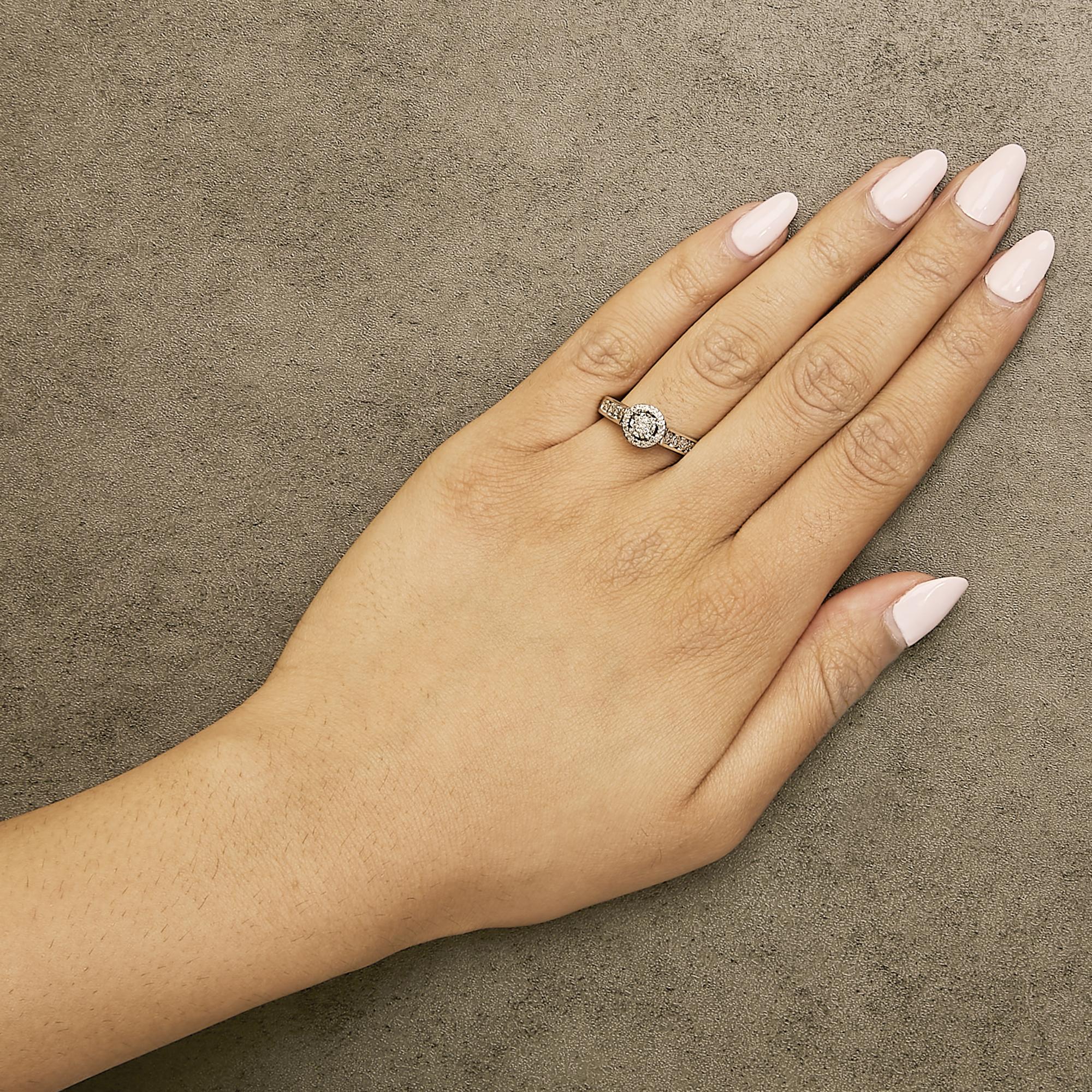 Imbued with a captivating sparkle, this exquisite ring is masterfully crafted from .925 sterling silver and is a testament to timeless elegance. At its heart, a mesmerizing cluster of natural diamonds dazzles in a halo setting, their delicate J-K color and I2-I3 clarity shimmering with an ethereal light. Each gemstone is meticulously held in prong settings, ensuring both security and optimal brilliance. The band itself is gracefully decorated with a cascade of accent diamonds, amplifying the overall luminance. This piece is not just jewelry; it is an emblem of sophistication, designed to add a touch of glamour to every occasion. With its refined diamond fashion halo style, it promises to be a cherished addition to any collection, evoking a sense of luxury and enchantment.