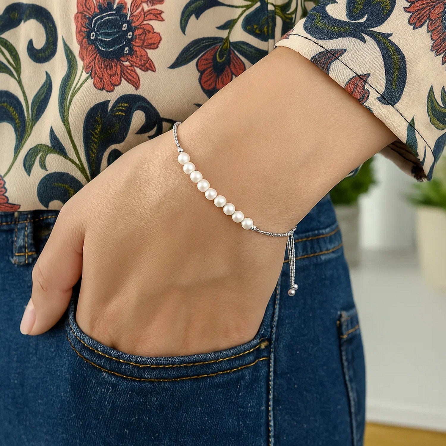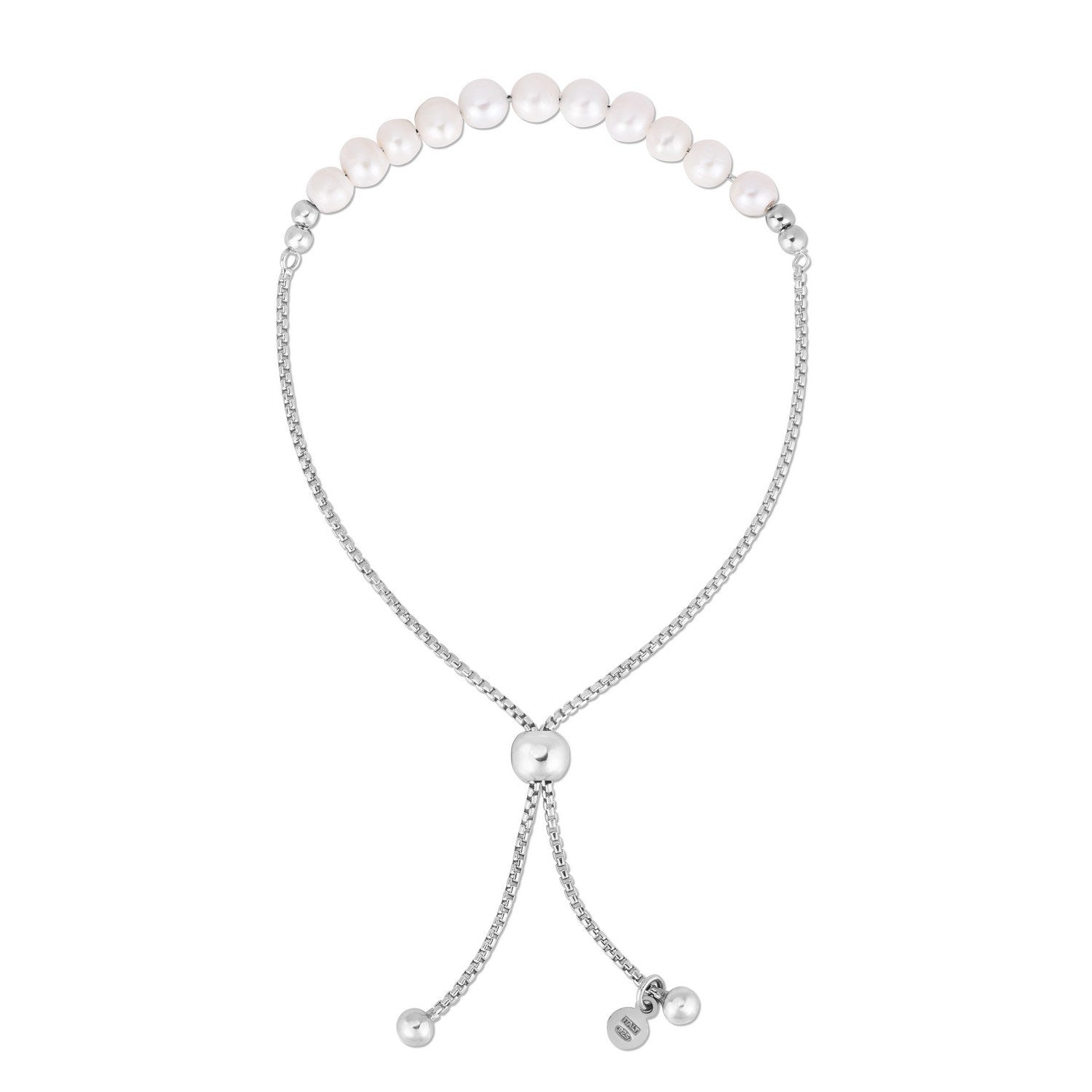 This sterling silver rhodium plated friendship bracelet features lustrous freshwater pearls on an adjustable drawstring chain. Its elegant shine and customizable fit make it a perfect everyday piece for gifting, layering, or adding a touch of timeless beauty.