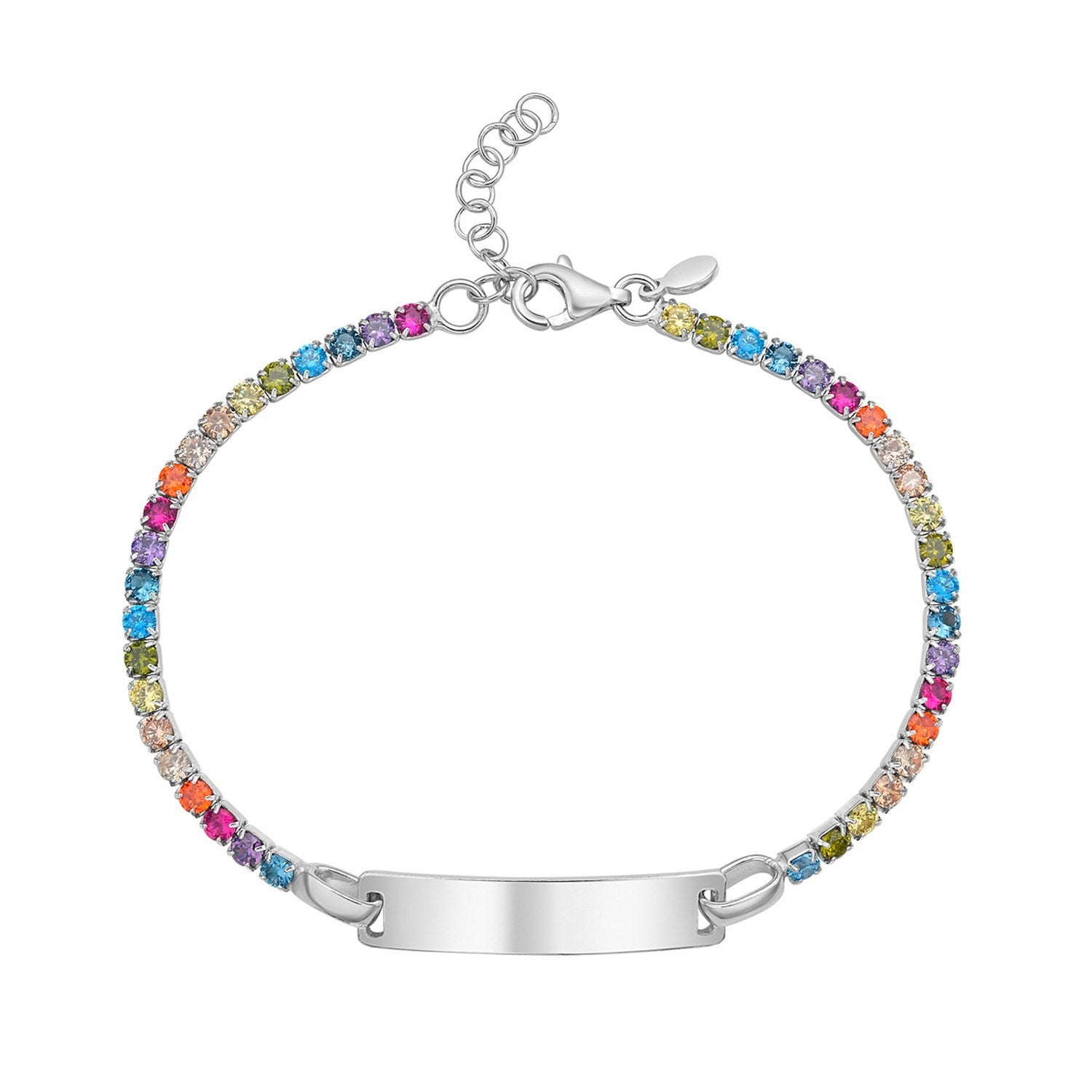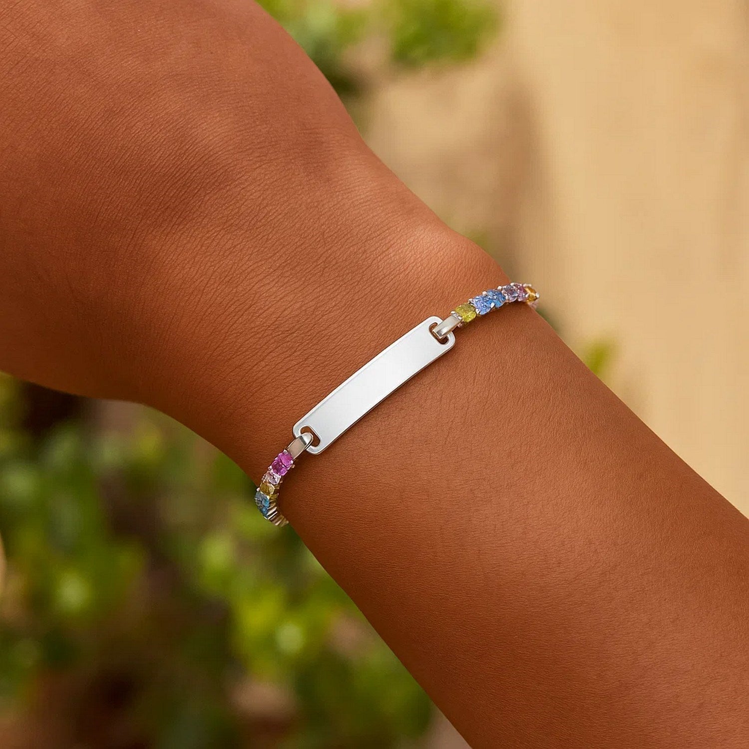 This stylish bracelet features a polished rhodium-plated sterling silver ID bar set with sparkling rainbow CZ stones. Its sleek, colorful design adds a vibrant touch to any look, perfect for layering or wearing solo.