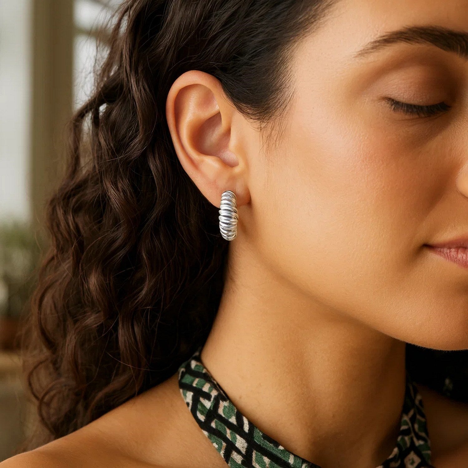 Chic sterling silver rhodium plated small ribbed twisted hoop earrings featuring a sleek, textured design with a radiant polished finish. The ribbed twist adds depth and sparkle, while the rhodium plating ensures lasting shine and elegance for everyday wear.